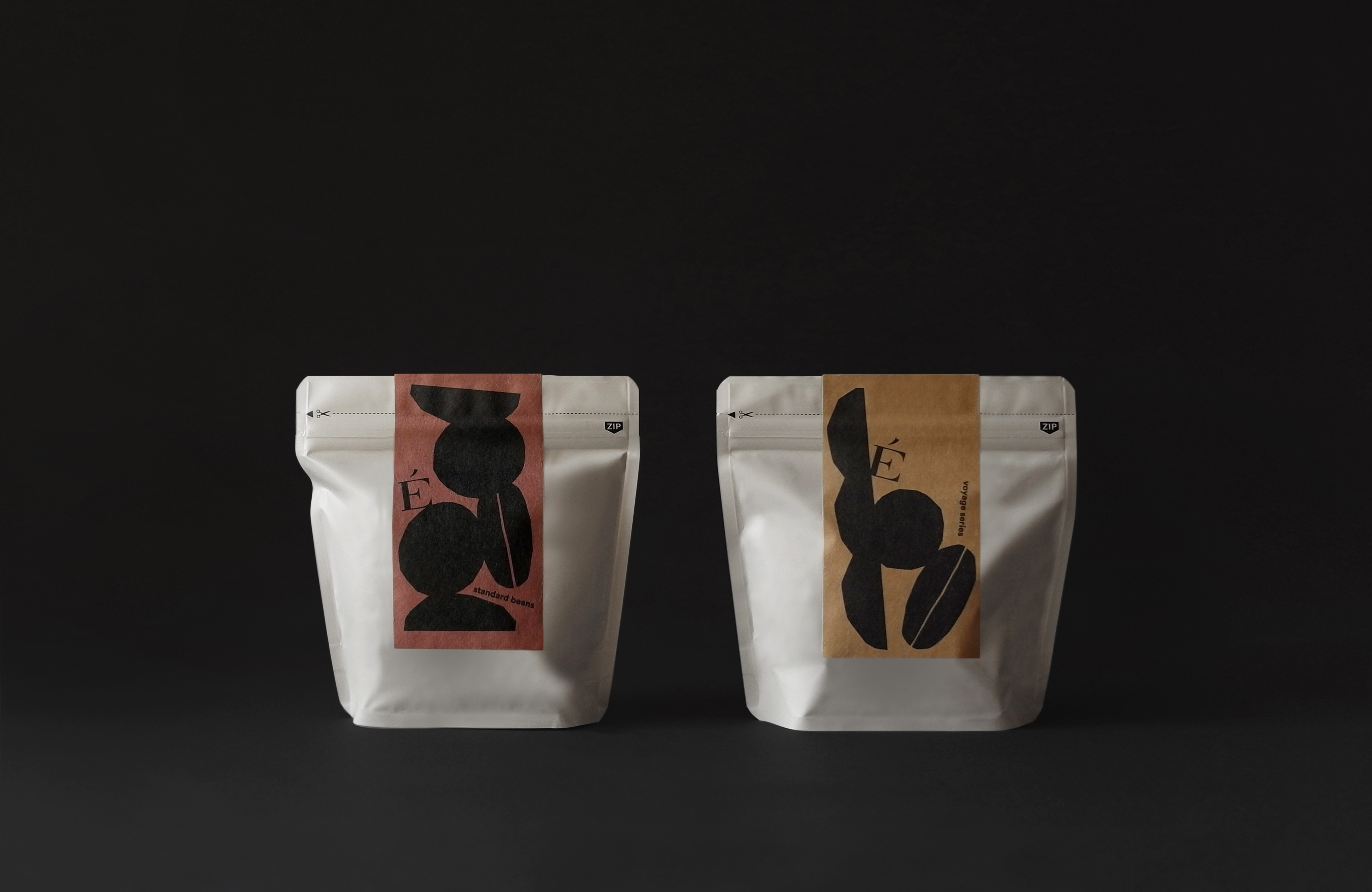 Branding and packaging design for a coffee stand & wine bar ‘ÉCRU’ in Fukuoka, Japan. The branding comprises ‘stacked’ coffee beans and grape berries. The elements, when stacked, form a new, accidental shapes—just like ÉCRU creating new chemical reactions by being a crossing point for coffee and wine drinkers.